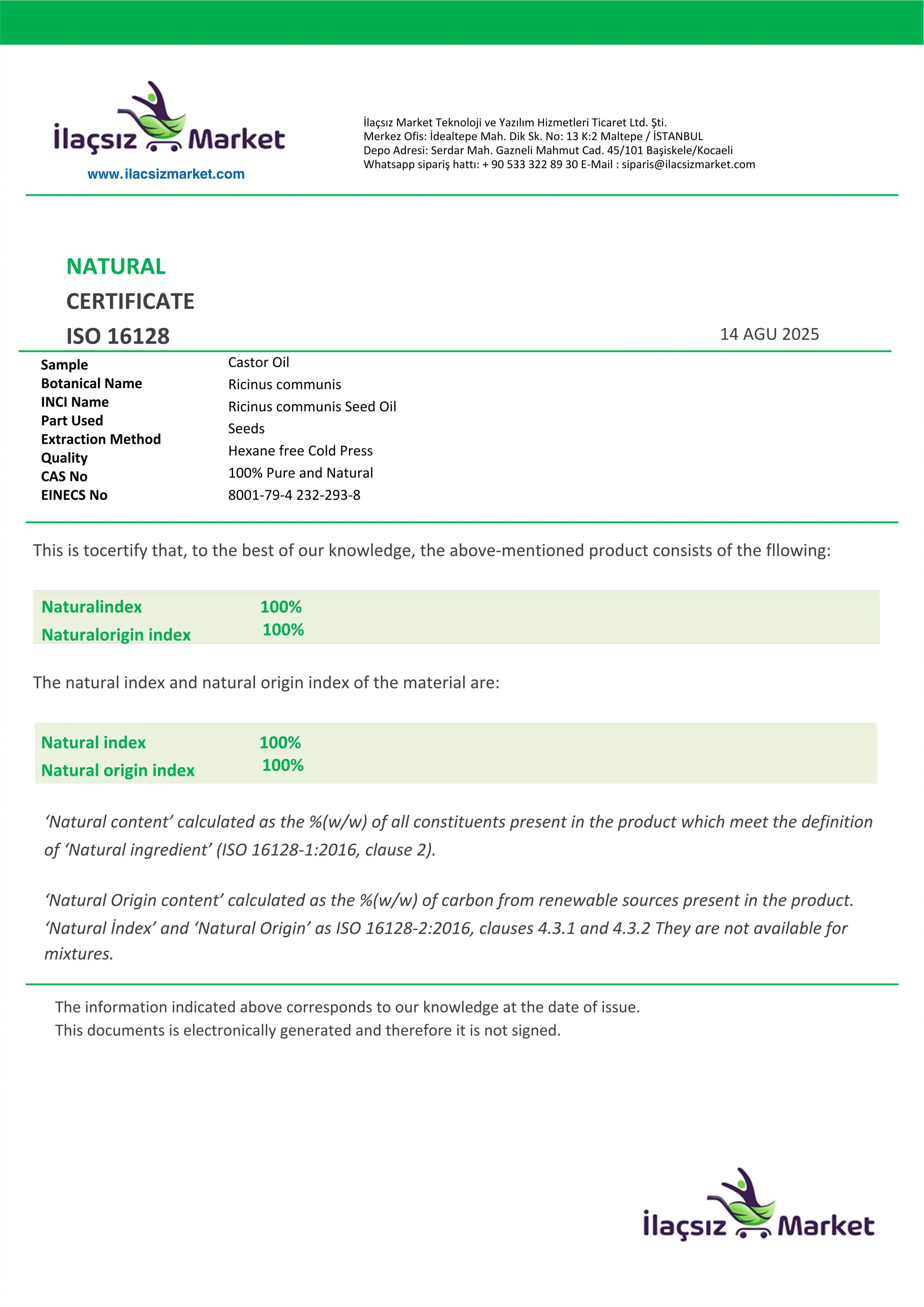 Hint Yağı, Ricinus communis bitkisinin tohumlarının soğuk sıkım yöntemiyle preslenmesiyle elde edilen doğal bir bitkisel yağdır. Yoğun yapılı, açık sarı renkte ve hafif keskin kokulu olan bu yağ; risinoleik asit, oleik asit, linoleik asit, palmitik asit gibi yağ asitleri ile E ve D vitamini, omega-6 yağ asitleri bakımından zengindir.