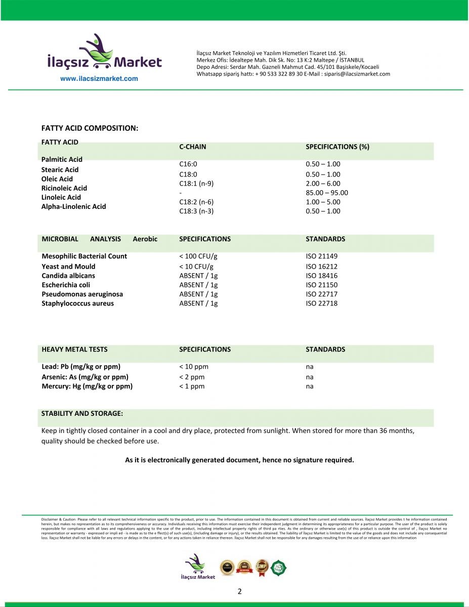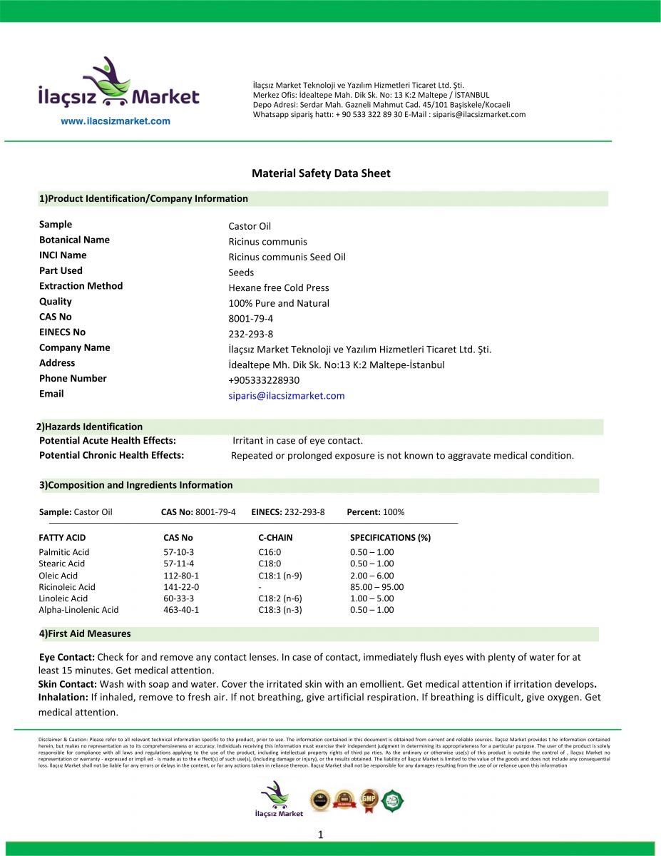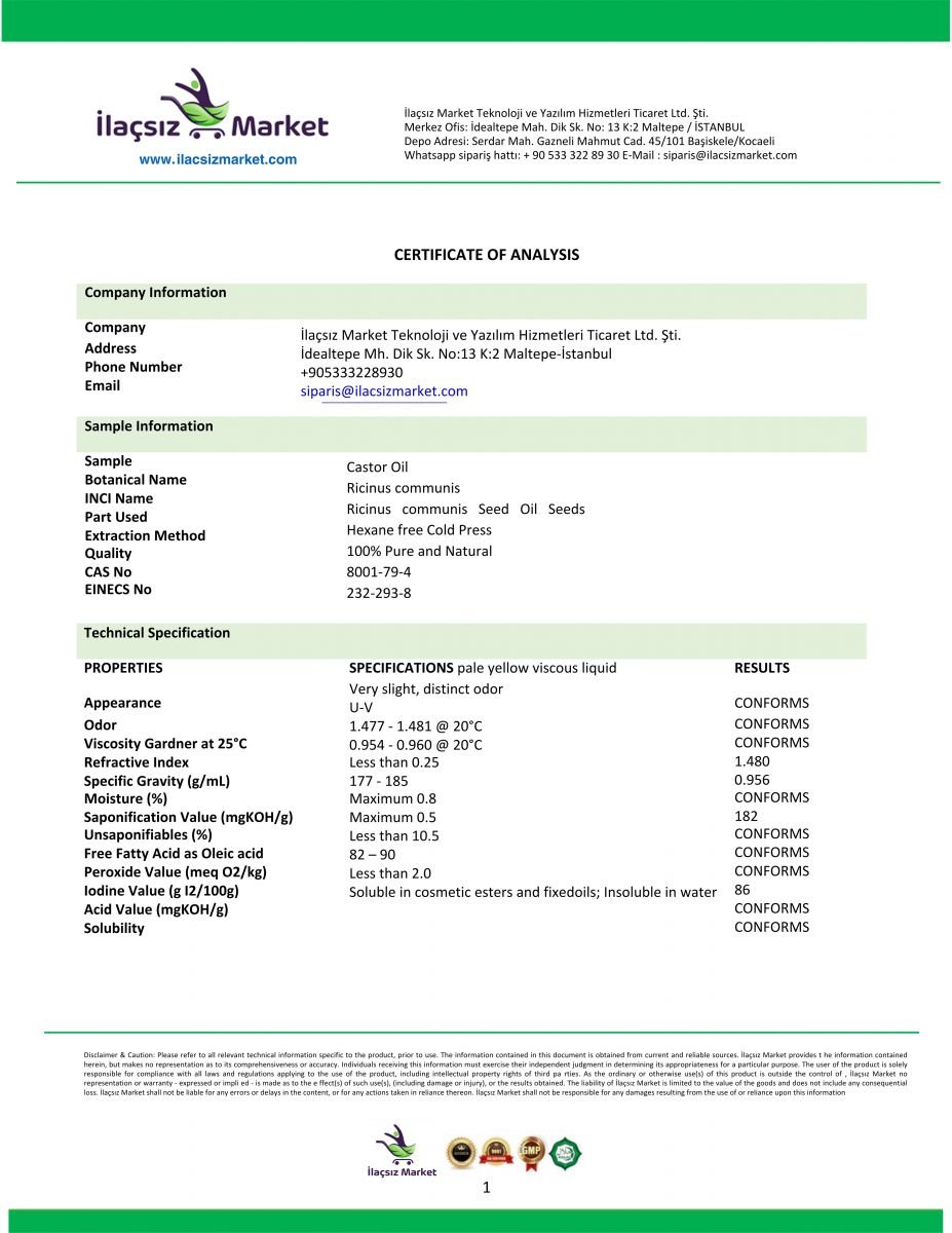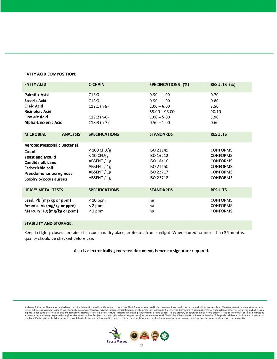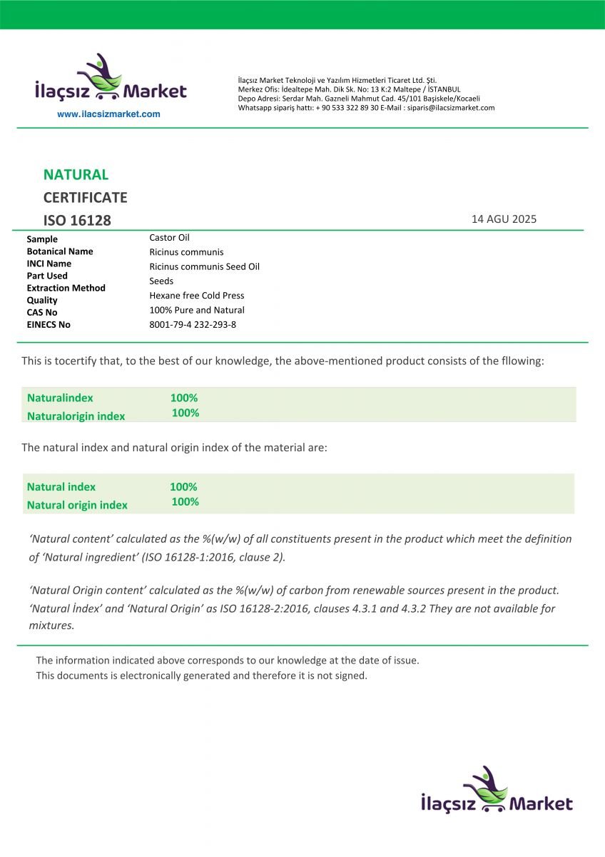ISO 16128 standardına göre hazırlanan doğallık sertifikasına göre hint yağı %100 doğal içerik ve %100 doğal köken indeksine sahiptir. Bu da yağın tamamen bitkisel, katkısız ve doğadan gelen yapısını bilimsel olarak kanıtlamaktadır.